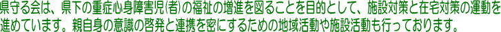 重症心身障害児(者)を、より多くの皆様方にご理解をしていただけるようにとの願いを込めて平成25年11月にホームページを立ち上げました。岡山県重症心身障害児(者)を守る会は障害のある子どもたちが不自由なく豊かな生活を楽しめるよう支えるための親の会です。もし在宅で重症心身障害児(者)と生活を共にしておられるご家族の皆様、共に頑張りましょう。